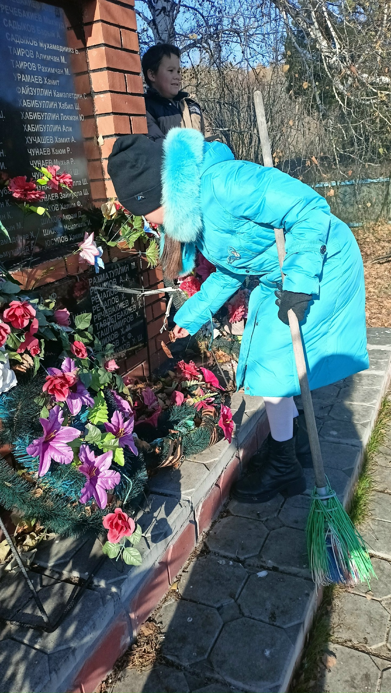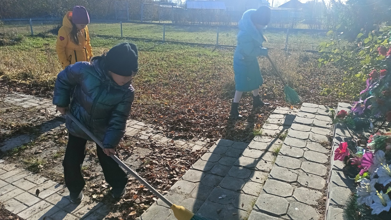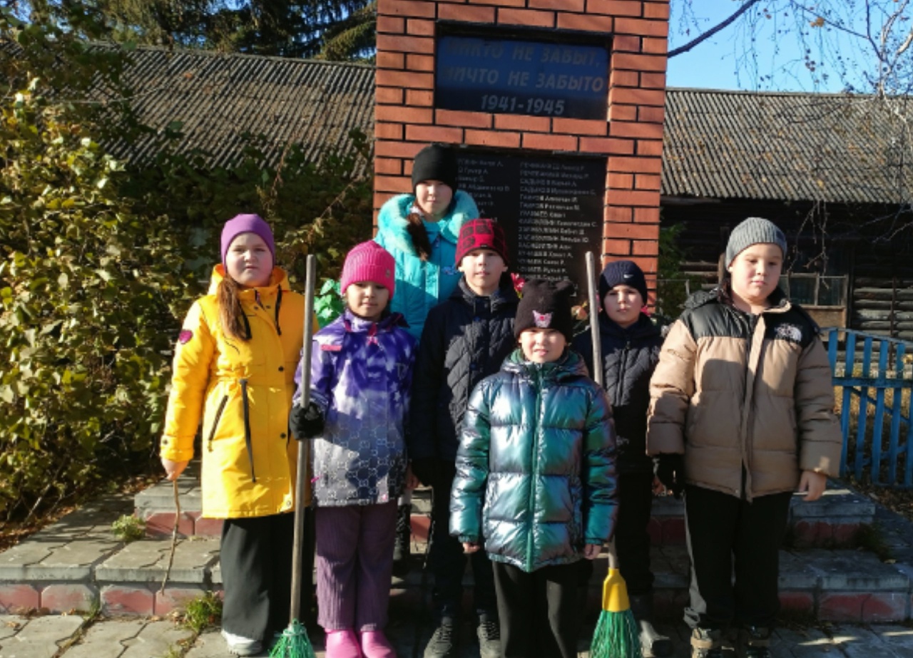 Ученики совместно с классным руководителем приняли участие в осеннем субботнике, организованном для уборки территории вокруг памятника воинам-землякам, павшим в Великой Отечественной войне.