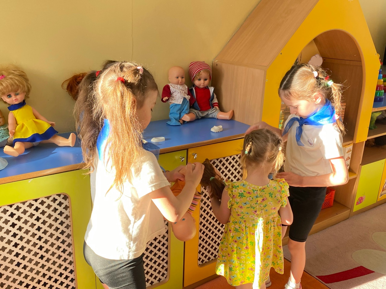 Они показывают своим примером добрые поступки и хорошие манеры поведения. После игр малыши нередко оставляют разбросанные игрушки – тут приходят на помощь старшие товарищи, демонстрируя аккуратность и дисциплину. Вместе весело прибирают кубики, машинки и другие игрушки обратно в корзины и шкафчики. Играют в подвижные и настольные игры. Помогают правильно одеваться на прогулку.