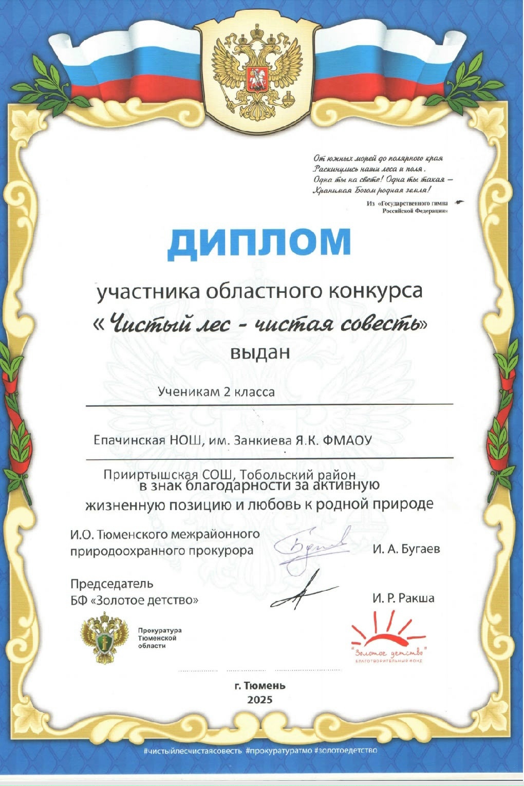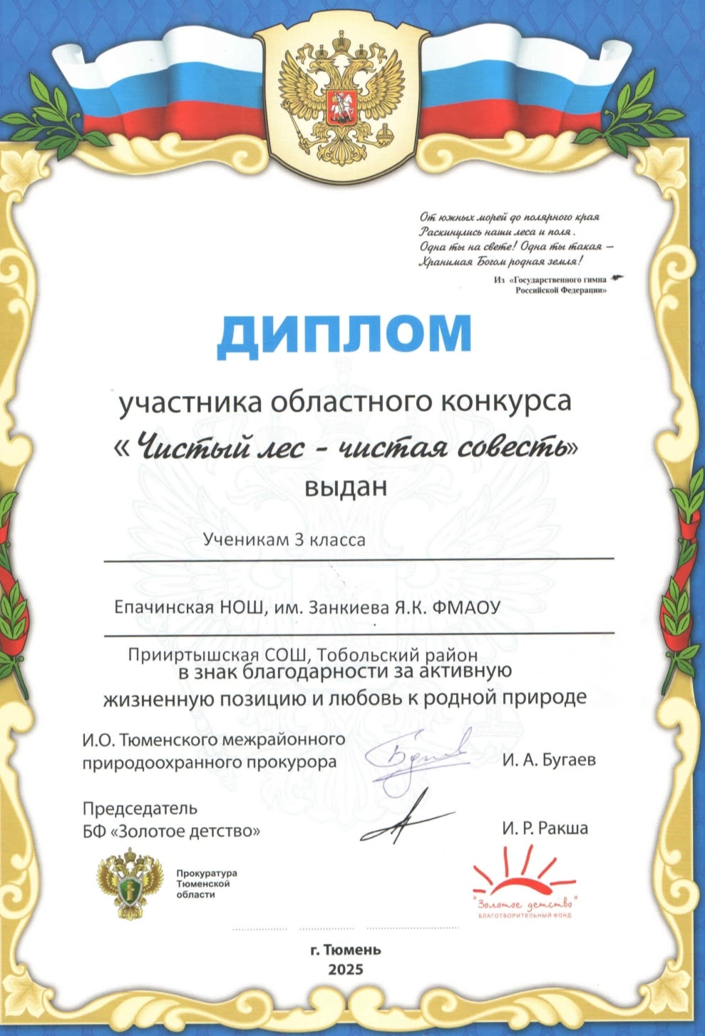 12 декабря в Тюменском индустриальном университете прошла торжественная церемония вручения наград победителям регионального конкурса «Чистый лес — чистая совесть». Этот масштабный экологический проект, направленный на повышение экологической ответственности жителей, в этом году собрал тысячи участников из всех муниципальных районов Тюменской области.