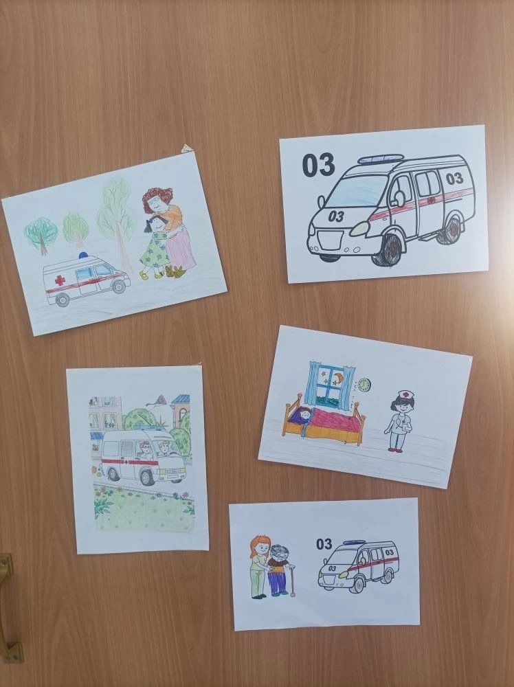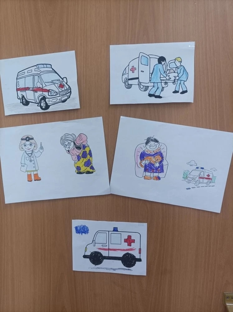 Ребята с помощью карандаша и фантазии изобразили, как важно не растеряться, если бабушке стало плохо: сразу позвать взрослых и вызвать скорую помощь. Каждый рисунок — это не только творчество, но и маленький урок заботы, внимания и ответственности.