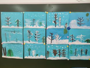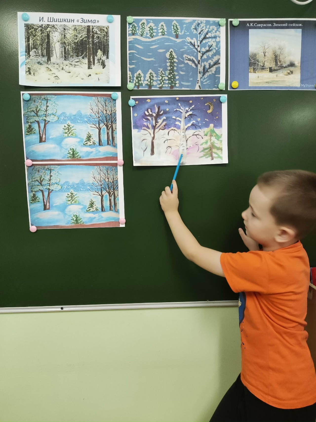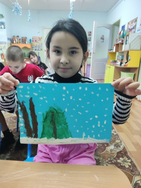 Каждый ребёнок хотел запечатлеть красоту зимнего леса, где среди белоснежного покрова возвышаются деревья: высокие и низкие.