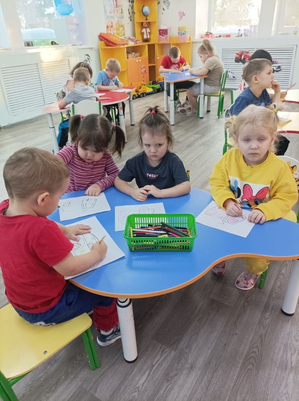 Закрепили умение располагать изображение на листе бумаги, упражнялись в рисовании и закрашивании рисунков цветными карандашами.