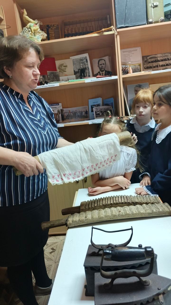 Руководитель музея Ольга Александровна Журавлева познакомила ребят с предметами русской старины: утюгом, ухватом, чугунами, старинной посудой, серпом и другими предметами. В музеях экспонаты трогать нельзя, а в нашем школьном музее ребята не только трогали, но и попробовали их в деле: подержали утюги, разглядели прялку, рассмотрели самовары, керосиновые лампы.