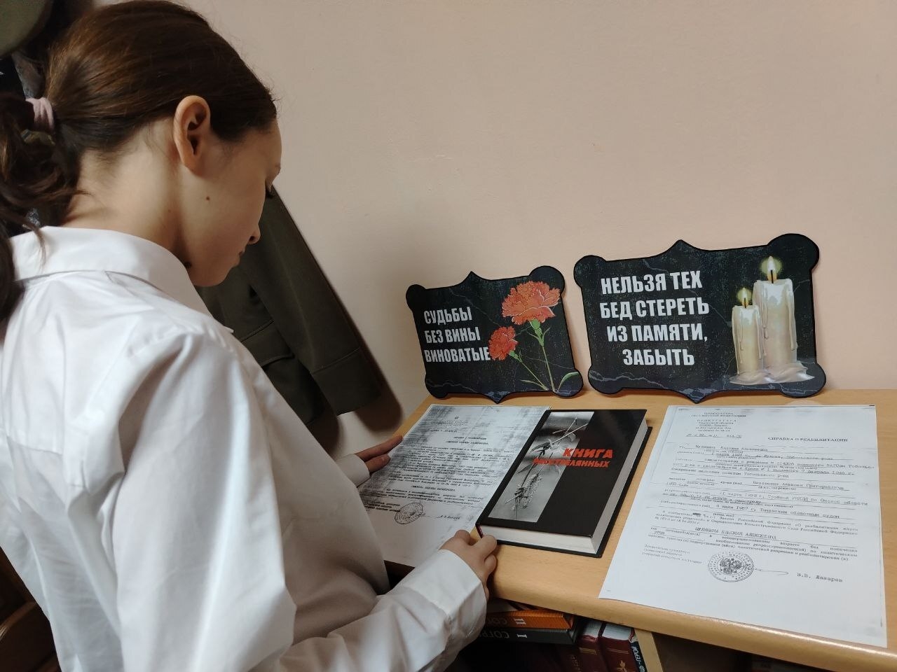 Руководитель школьного музея Ольга Александровна Журавлева рассказала детям о трагических страницах в истории страны, когда тысячи людей были необоснованно подвергнуты репрессиям, обвинены в преступлениях, отправлены в исправительно-трудовые лагеря, в ссылку и на спецпоселения, лишены жизни.
