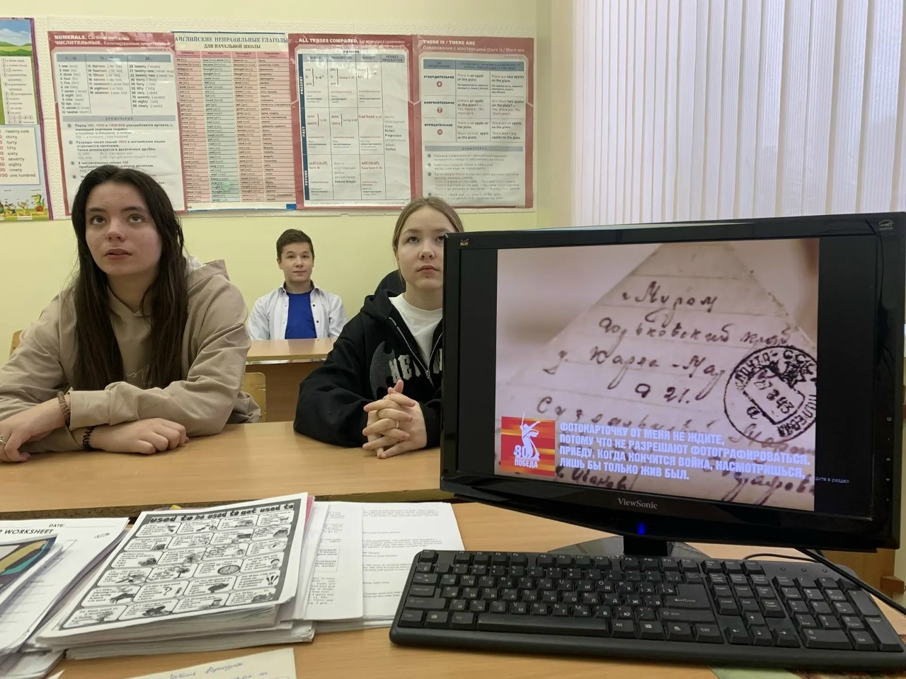 Учащиеся посмотрели видеоуроки, посвященные выставке «Голоса войны». Затем прочитали три письма, которые написали солдаты своим родным на трех языках: русском, татарском и английском. Дети сопереживали солдатам, которые писали в письмах о своих трудностях и личных переживаниях. -