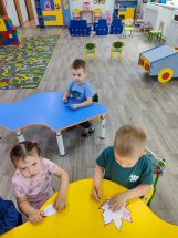 Сегодня в гости пришёл зайка, и ребята с большой радостью отправились с ним в лес на прогулку. Там они прошли через различные препятствия, собирали листья, играли с ними. Вспомнили, почему осенью листья меняют окрас, что такое листопад. Во время прогулки по осеннему лесу ребята повстречали лесных жителей, вспомнили, чем они питаются, как зимуют. С мишкой они поиграли в подвижную игру » У медведя во бору» . Потом разукрашивали осенние листья. Дети получили заряд бодрости и отличное настроение, закрепили признаки осени и узнали много нового.